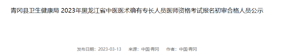 青岡縣2023年黑龍江省中醫(yī)醫(yī)術(shù)確有專(zhuān)長(zhǎng)人員醫(yī)師資格考試報(bào)名初審合格人員公示,醫(yī)學(xué)教育網(wǎng)老師為大家整理總結(jié)如下,希望可以幫助到各位: