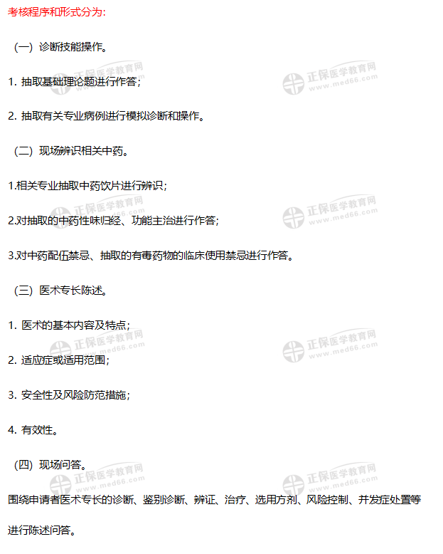 醫(yī)術淵源或者傳承脈絡、醫(yī)術內容及特點;與擅長治療的病證范圍相關的中醫(yī)基礎知識、中醫(yī)診斷技能、中醫(yī)治療方法、中藥基本知識和用藥安全等。