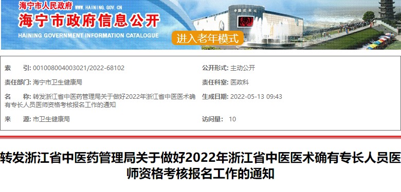 關(guān)于做好2022年浙江省海寧市中醫(yī)醫(yī)術(shù)確有專長人員醫(yī)師資格考核報名工作的通知,醫(yī)學(xué)教育網(wǎng)編輯為您搜集整理了相關(guān)文件,請考生及時查看!
