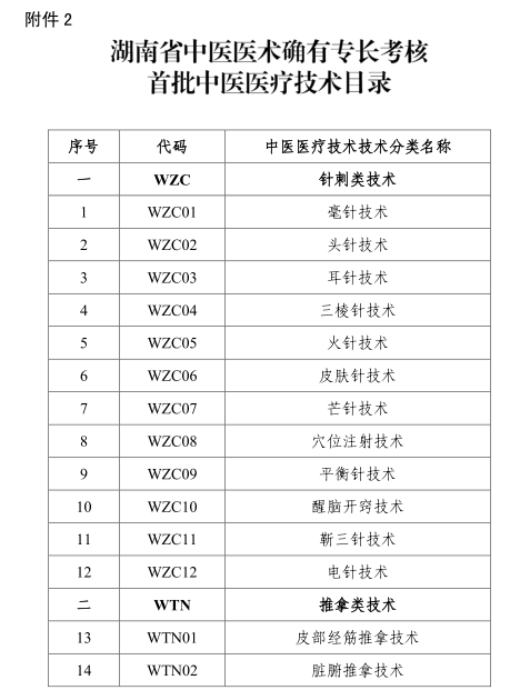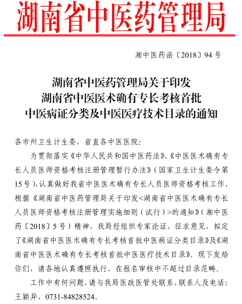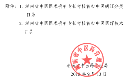 2018年8月2日,湖南省中醫(yī)藥管理局?jǐn)M定了《湖南省中醫(yī)醫(yī)術(shù)確有專長(zhǎng)人員考核首批中醫(yī)病證分類目錄(征求意見稿)》及《湖南省中醫(yī)醫(yī)術(shù)確有專長(zhǎng)考核首批中醫(yī)醫(yī)療技術(shù)目錄(征求意見稿)》。
