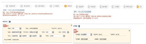 考生在完成注冊并完善個人信息后,點擊考試報名,報名共有①-⑦七個步驟,當進行到第五、六步時,請注意一定要點選“選擇”旁的方框,此時生成的報名申請表中才能顯示學校、專業(yè)、資格證編號、執(zhí)業(yè)證編號等信息。如下圖紅框處: