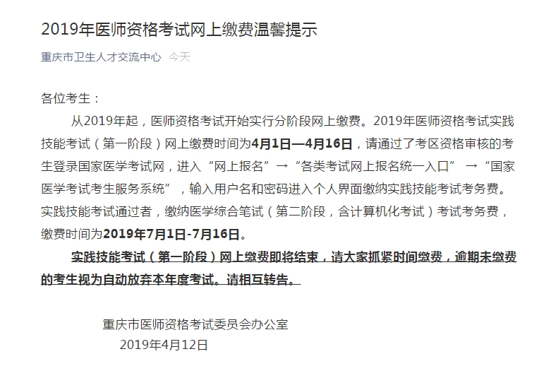 2019年重慶市中醫(yī)執(zhí)業(yè)助理醫(yī)師網(wǎng)上繳費即將截止!具體通知內(nèi)容,請相關(guān)考生仔細(xì)閱讀以下通知內(nèi)容。