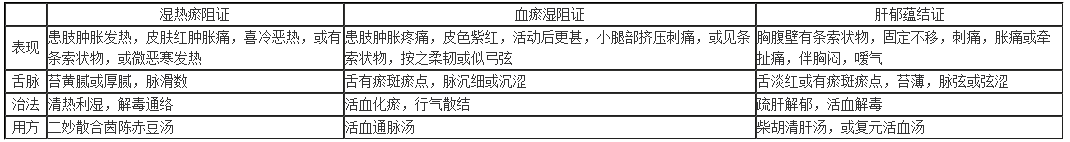 2.后期(慢性期):患處遺有一條索狀物,色黃褐,按之如弓弦,有按壓痛,或結(jié)節(jié)破潰后形成臁瘡。
