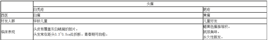 C.白禿瘡:西醫(yī)之白癬(灰白色鱗屑,頭皮0.3-0.8CM處折斷。青春期自愈)