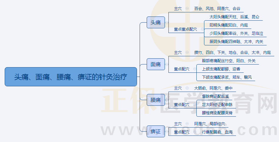 《方劑學》科目——2022年中醫(yī)執(zhí)業(yè)助理醫(yī)師思維導圖考點梳理:頭痛、面痛、腰痛、痹證的針灸治療