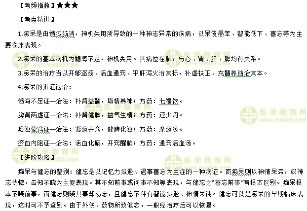 2019年中醫(yī)執(zhí)業(yè)助理醫(yī)師考試越來越近,復(fù)習(xí)時(shí)間逐漸緊張,牢記考點(diǎn)、吃透考點(diǎn)需要有計(jì)劃地復(fù)習(xí)鞏固,為幫助大家更好地復(fù)習(xí)本部分內(nèi)容,醫(yī)學(xué)教育網(wǎng)編輯將“中醫(yī)執(zhí)業(yè)助理醫(yī)師備考精華考點(diǎn)小結(jié)及例題精講——癡呆”具體資料為大家整理如下: