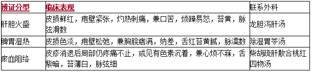 主癥 初起時患部皮膚灼熱刺痛、發(fā)紅,繼則出現(xiàn)簇集性粟粒大小丘狀皰疹,多呈帶狀排列,多發(fā)生于身體一側(cè)腰脅部。(相當(dāng)于帶狀皰疹)
