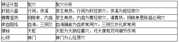 配穴:肝膽火盛配行間、俠溪;脾胃濕熱配陰陵泉、內(nèi)庭;瘀血阻絡(luò)配血海、三陰交。便秘配天樞;心煩配神門。