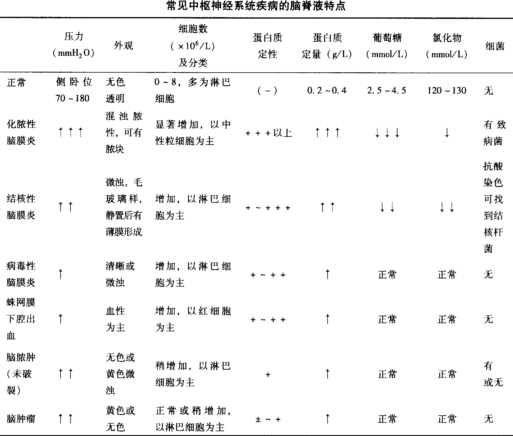 常見中樞神經(jīng)系統(tǒng)疾病的腦脊液的特點,見下表。