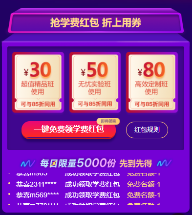 2019年12月9日-2019年12月12日(24:00)期間用戶可來頁面免費領取學費紅包(活動期間內用戶僅限領取一次),學費紅包內含30元、50元、80元優(yōu)惠券,