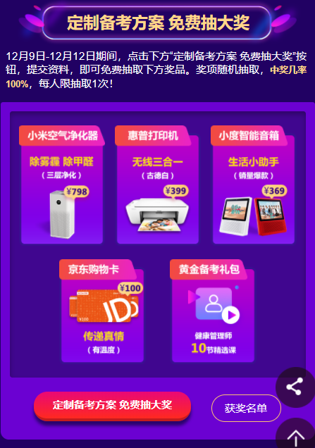 12月9日-12月12日期間,點擊下方“定制備考方案 免費抽大獎”按鈕,提交資料,即可免費抽取下方獎品。獎項隨機抽取,中獎幾率100%,每人限抽取1次!