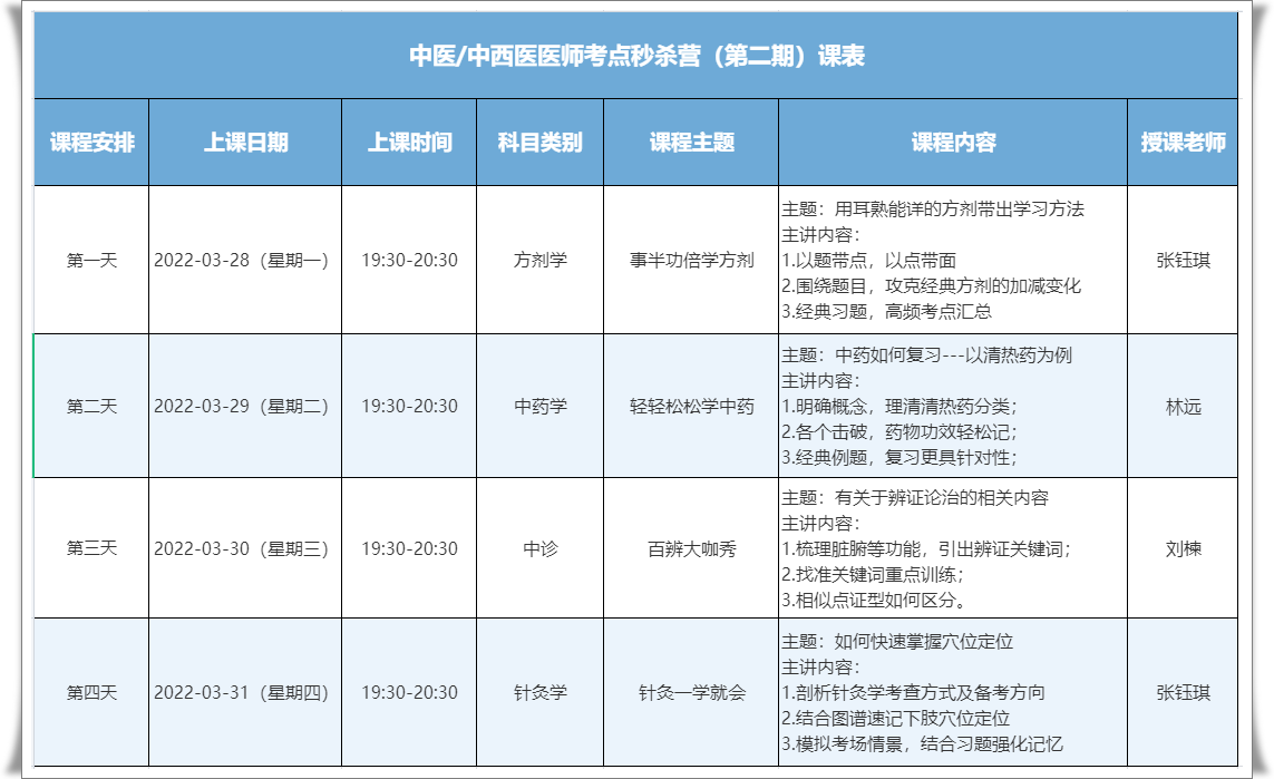 Day1-Day4網(wǎng)校資深講師張鈺琪、劉楝、林遠將帶領大家拿下方劑學、中藥學、中醫(yī)診斷學、針灸學四大科目歷年高頻考點,拒絕死記硬背,串聯(lián)考點體系,撈分有招!