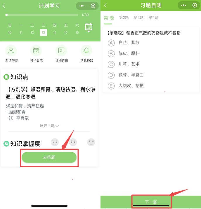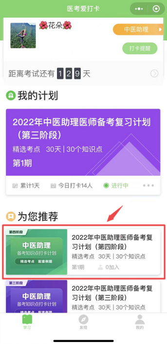 如中醫(yī)執(zhí)業(yè)助理醫(yī)師備考復習計劃(第四階段),然后點擊下方“加入計劃 開始學習”按鈕,開始正式進入打卡學習。