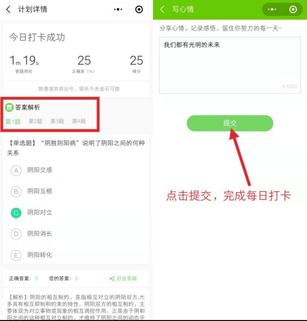 (3)查看測試結果+答案解析+分享今日打卡心情,提交完成打卡