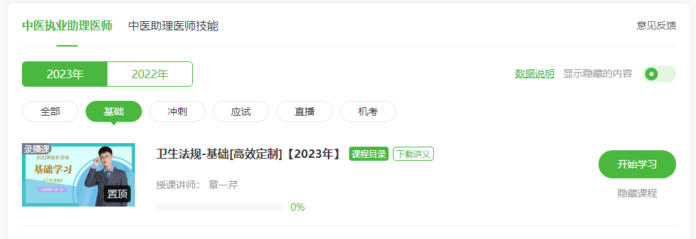 2023年醫(yī)學教育網(wǎng)中醫(yī)執(zhí)業(yè)助理醫(yī)師《衛(wèi)生法規(guī)》科目基礎學習班新課開通!目前由章一芹老師授課的《衛(wèi)生法規(guī)》科目課程已更新!已購課同學可以直接進入我的網(wǎng)校我的家-我的課程-衛(wèi)生法規(guī)學科目進行學習!2023年中醫(yī)執(zhí)業(yè)助理醫(yī)師《衛(wèi)生法規(guī)》考試大綱/教材與2022年相比有部分變動。具體內容下方查看。未購課學員點擊此處進入選擇課程>,具體看課位置如下: