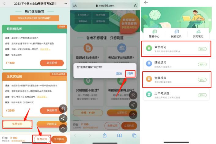3.若在手機瀏覽器中進入2023中醫(yī)助理醫(yī)師《密題庫》方案頁,點擊任意一處【免費試用】按鈕,允許網(wǎng)站打開【醫(yī)學教育網(wǎng)】APP,即可進入試用。