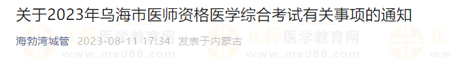 內(nèi)蒙古考區(qū)烏海市考點(diǎn)關(guān)于2023年醫(yī)師資格考試有關(guān)事項(xiàng),請(qǐng)烏海市考點(diǎn)的各位考生8月11起打印準(zhǔn)考證并準(zhǔn)時(shí)參加考試,并提前規(guī)劃考場(chǎng)路線避免錯(cuò)過考試,具體內(nèi)容如下: