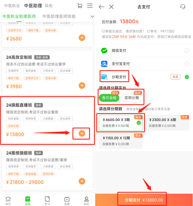 第二步:選擇“中醫(yī)助理醫(yī)師-24面授直播班”點(diǎn)擊“+”,添加購(gòu)物車。點(diǎn)擊“去結(jié)算”,選擇“分期付款”,分期平臺(tái)及期數(shù)選擇后,點(diǎn)擊“分期支付”。