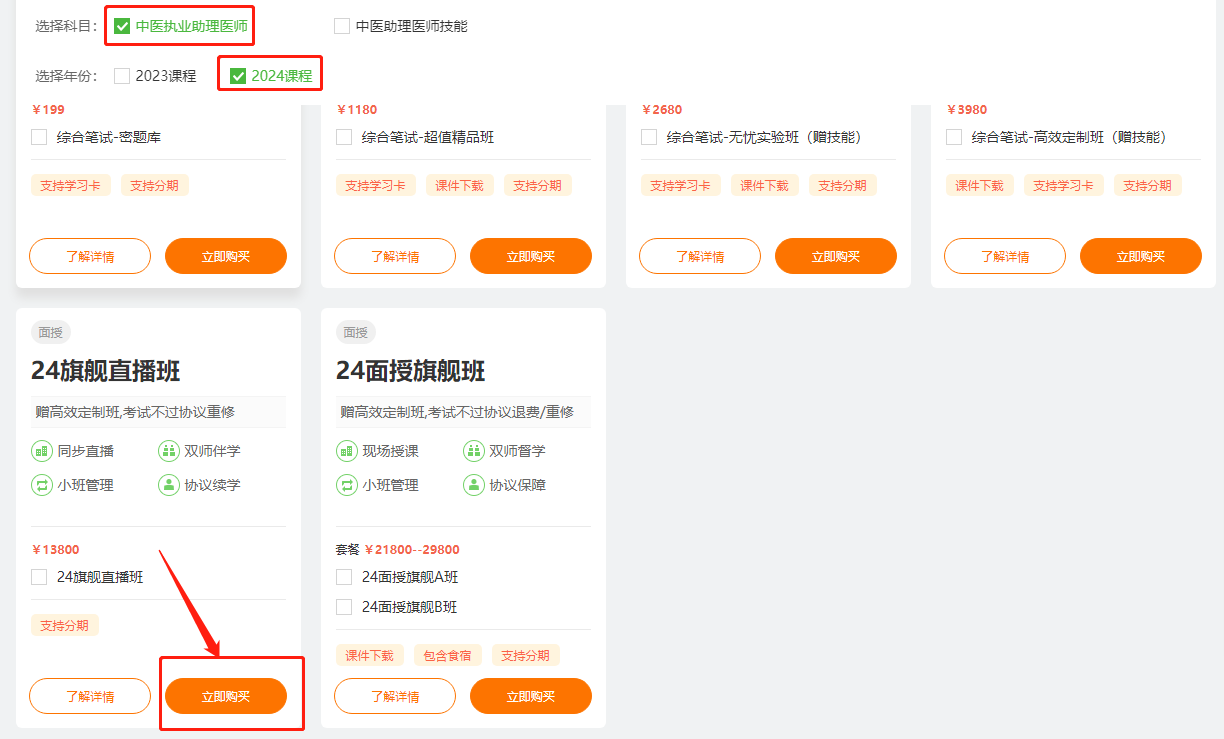 一、打開醫(yī)學教育網(wǎng),登錄學員代碼,進入選課中心,選擇需要購買的課程(中醫(yī)助理醫(yī)師面授直播班),點擊立即購買;