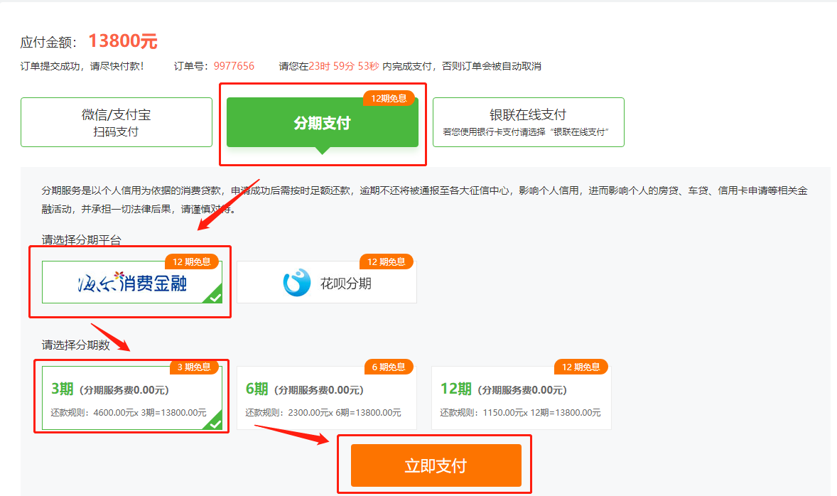 三、選分期支付-海爾消費金融/花唄分期,都支持3/6/12期免息,可根據(jù)自己實際情況選擇后去支付。