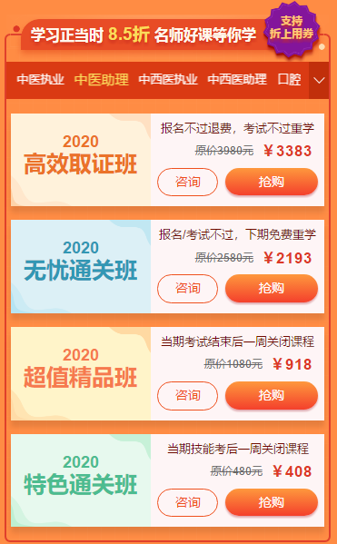 2019年中醫(yī)執(zhí)業(yè)助理醫(yī)師成績公布,也就是說2019年中醫(yī)執(zhí)業(yè)助理醫(yī)師考試告一段落,2020年中醫(yī)執(zhí)業(yè)助理醫(yī)師考試備考正式開啟!同樣,醫(yī)學(xué)教育網(wǎng)為大家送來2020年中醫(yī)執(zhí)業(yè)助理醫(yī)師的優(yōu)惠課程,請查收!