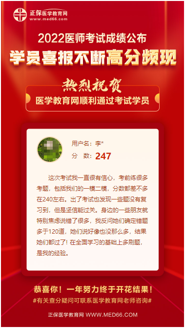 2022年醫(yī)師資格考試成績(jī)公布后,醫(yī)學(xué)教育網(wǎng)學(xué)員喜報(bào)不斷,高分頻現(xiàn)!在此醫(yī)學(xué)教育網(wǎng)小編熱烈祝賀各位順利通過(guò)考試的同學(xué)!同時(shí)也將大家成功的喜悅、備考心得一起分享給2023年考生。一起來(lái)看看吧!