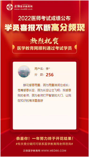 2022年醫(yī)師資格考試成績(jī)公布后,醫(yī)學(xué)教育網(wǎng)學(xué)員喜報(bào)不斷,高分頻現(xiàn)!在此醫(yī)學(xué)教育網(wǎng)小編熱烈祝賀各位順利通過考試的同學(xué)!同時(shí)也將大家成功的喜悅、備考心得一起分享給2023年考生。一起來看看吧!