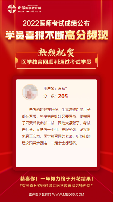 “備考的時(shí)候在懷孕,生完娃娃后坐月子都在看書,每晚哄完娃娃又要看書,做完月子四天后就參加一試,因?yàn)樘o張了,考試差幾分,又備考一個(gè)月,克服緊張,發(fā)揮出來(lái)真正實(shí)力。醫(yī)學(xué)教育網(wǎng)的老師,聽(tīng)他們的建議跟著步驟走,一定會(huì)金榜題名! "