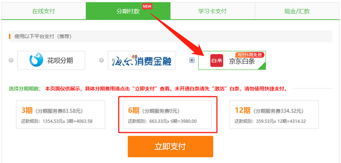 特別提醒:只有6期分期購(gòu)買服務(wù)費(fèi)為0元,其他期數(shù)暫時(shí)沒有優(yōu)惠。