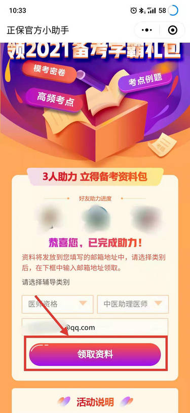 三、助力滿三人進入領(lǐng)取頁面,輸入類別/郵箱,點擊“領(lǐng)取資料”,即可領(lǐng)取“學(xué)霸禮包”。