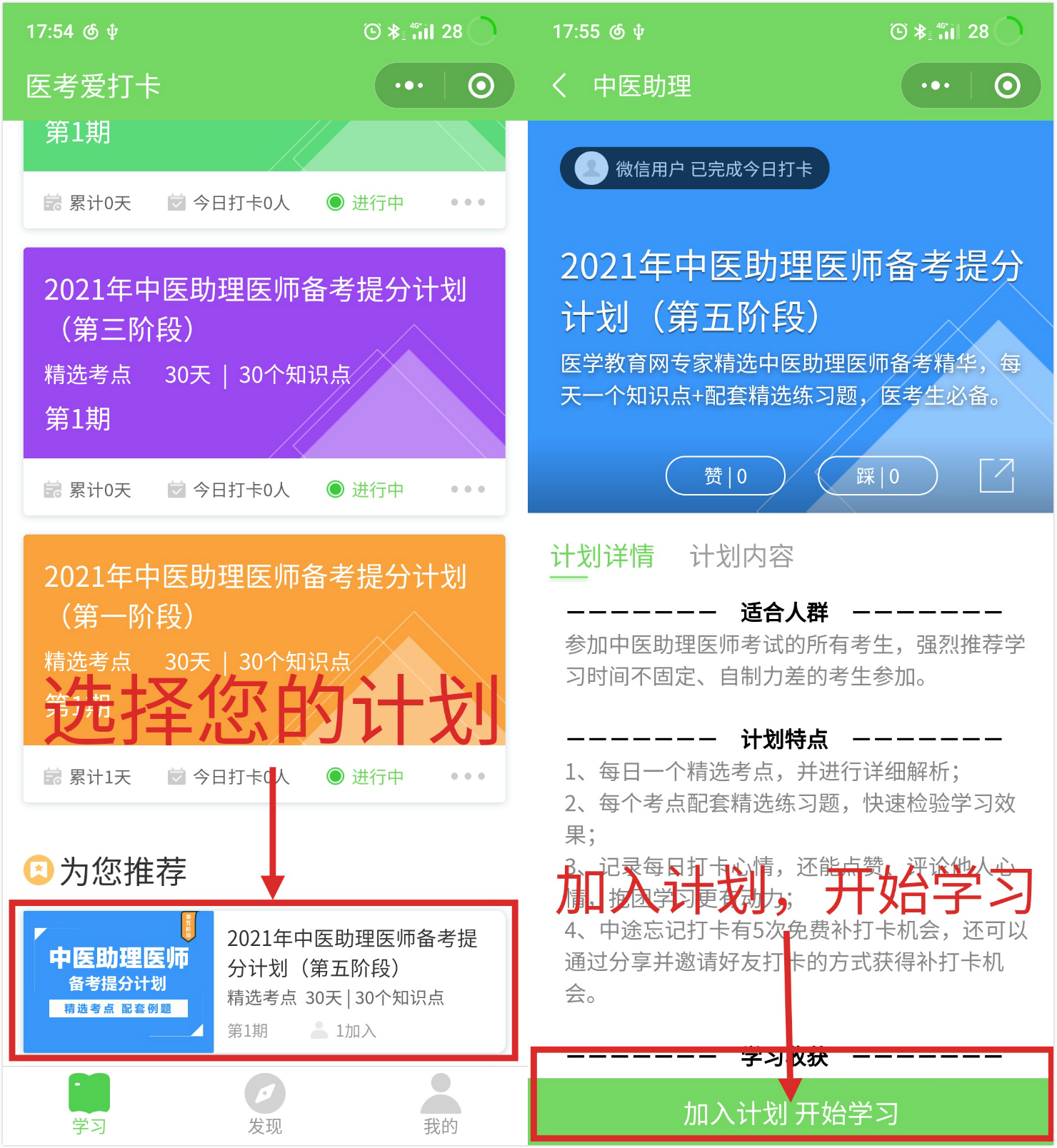 第三步:選擇備考科目后即進(jìn)入學(xué)習(xí)計(jì)劃選擇的頁(yè)面,請(qǐng)選擇“您的備考計(jì)劃”,如2021年中醫(yī)助理醫(yī)師備考**計(jì)劃(第五階段),然后點(diǎn)擊下方“加入計(jì)劃開(kāi)始學(xué)習(xí)”按鈕,開(kāi)始正式進(jìn)入打卡學(xué)習(xí);