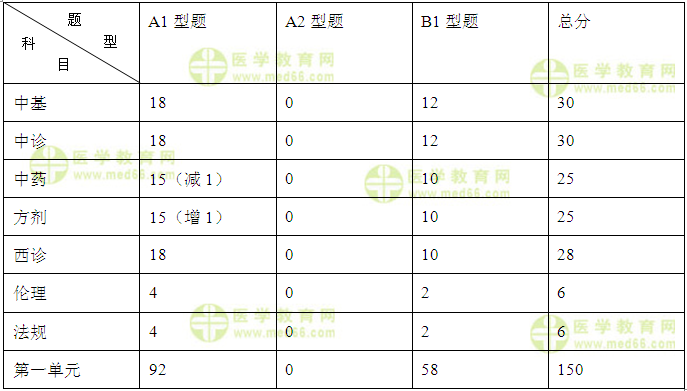 第一單元:中醫(yī)基礎(chǔ)30;中藥25;方劑25;中診30;西診28;倫理學(xué)6;衛(wèi)生法規(guī)6.