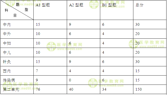 第二單元:中醫(yī)內(nèi)科30;中醫(yī)外科20;中醫(yī)婦科20;中醫(yī)兒科20;針灸30;西醫(yī)內(nèi)科15;傳染病15.