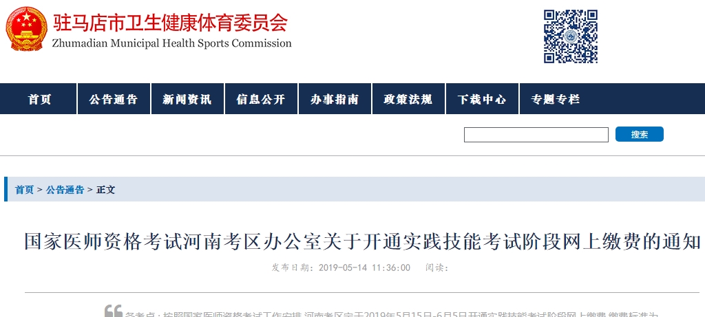 按照國家醫(yī)師資格考試工作安排,河南考區(qū)定于2019年5月15日-6月5日開通實踐技能考試階段網(wǎng)上繳費,繳費標準為 280元/人。逾期未繳費者視為放棄實踐技能考試資格。