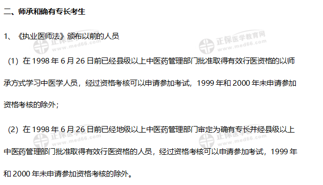 (1)師承人員申請參加中醫(yī)醫(yī)師資格考試需具備:高中以上文化程度或者具有同等學(xué)力,并連續(xù)跟師學(xué)習(xí)滿3年。指導(dǎo)老師必須具有中醫(yī)、民族醫(yī)執(zhí)業(yè)醫(yī)師資格并從事中醫(yī)、民族醫(yī)臨床工作十五年以上或具有中醫(yī)、民族醫(yī)醫(yī)學(xué)專業(yè)副主任醫(yī)師以上專業(yè)技術(shù)職務(wù)任職資格;