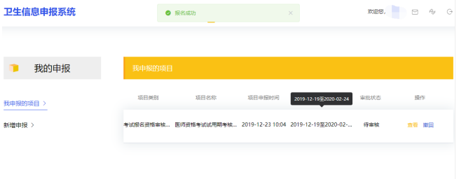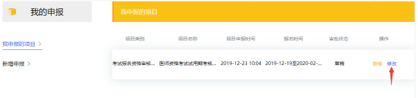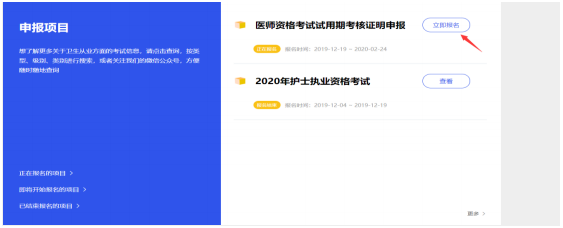 1.點擊首頁下的申報項目菜單,選擇醫(yī)師資格考試試用期考核證明申報進行項目報名。