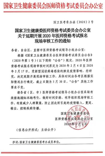 國家衛(wèi)健委關于延期開展2020年醫(yī)師資格考試報名現(xiàn)場審核工作的通知