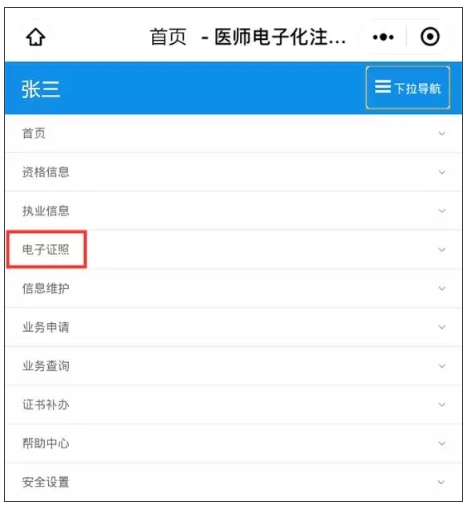 ④點擊右上角【下拉導(dǎo)航】進(jìn)入【電子證照】功能;