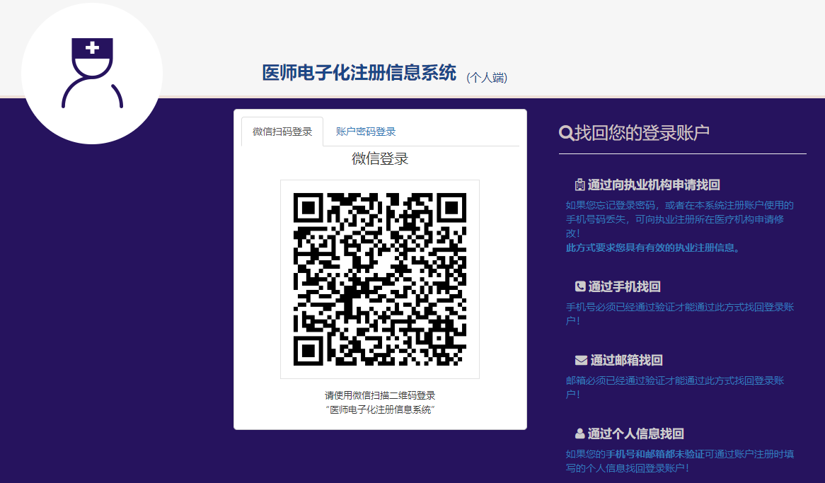 2.選擇“微信掃碼登錄”,請(qǐng)使用微信掃描二維碼登錄“醫(yī)師電子化注冊(cè)信息系統(tǒng)(個(gè)人端)”。