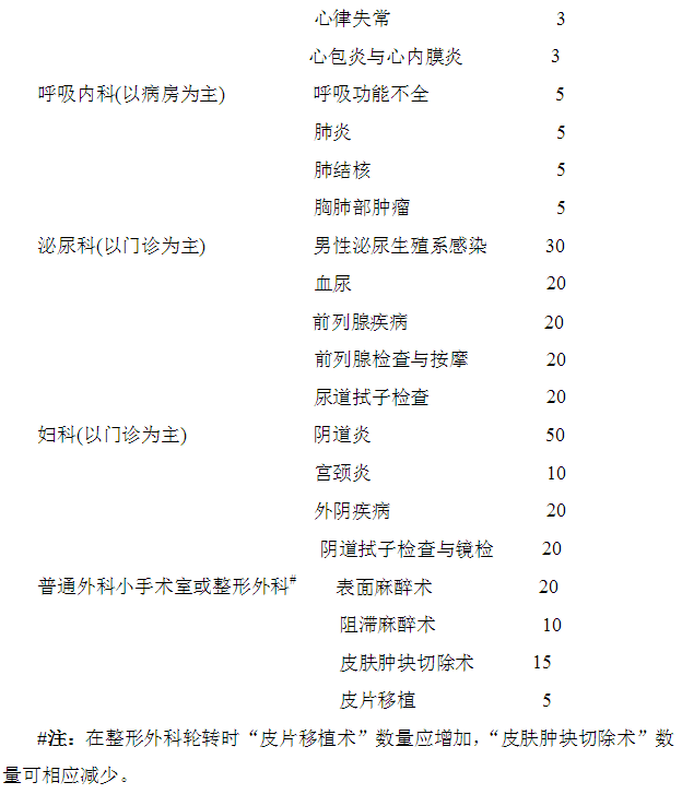 (1)門診必須學(xué)習(xí)的病種及例數(shù): 帶狀皰疹、單純皰疹,疣(尋常疣、扁平疣、傳染性軟疣等);淺部真菌?。磺蚓腥拘云つw?。摪挴?、毛囊炎、癤、癰、丹毒、蜂窩織炎等);各種類型的皮炎、濕疹;蕁麻疹;藥疹;多形紅斑;銀屑病與副銀屑?。幻倒蹇氛?;各種類型脫發(fā);痤瘡與粉刺;神經(jīng)性皮炎與皮膚瘙癢癥;白癜風(fēng)等色素減少性皮膚病,黃褐斑、色素痣等色素增加性皮膚?。获:鄹泶?;脂溢性角化癥等。以上每一病種(或每類)必須經(jīng)診30例以上。