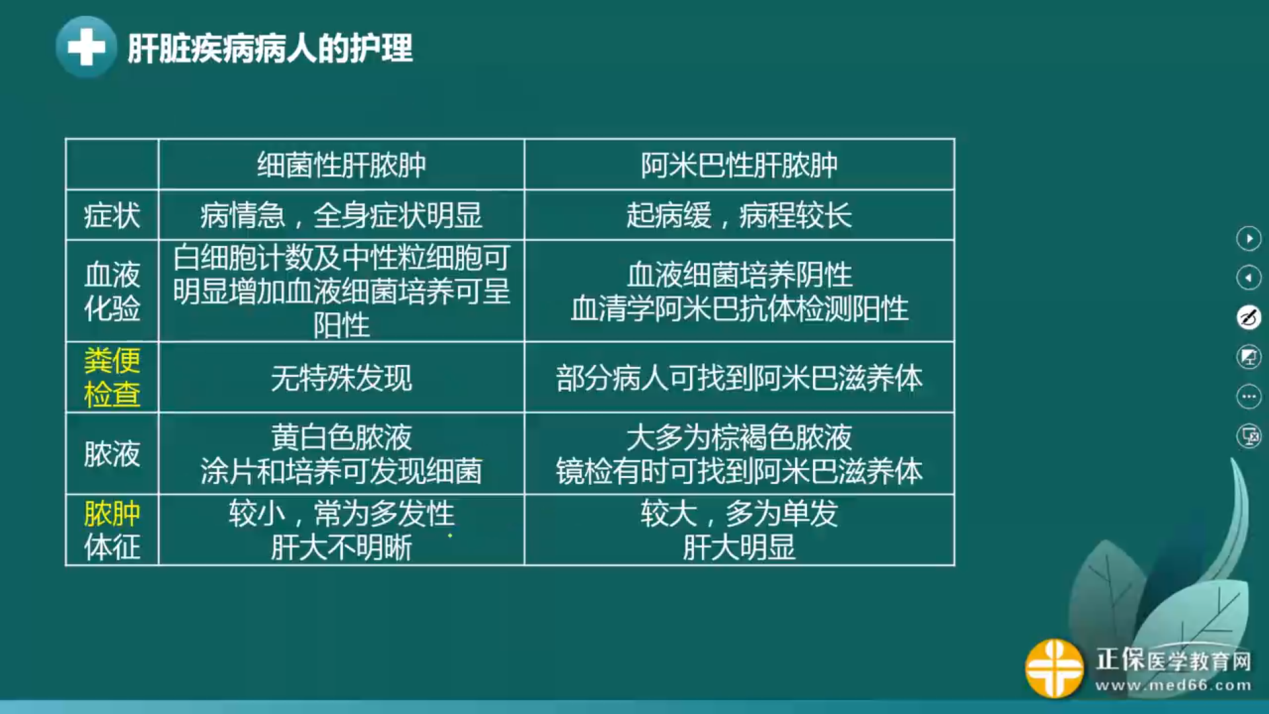 臨床以細(xì)菌性肝膿腫和阿米巴性肝膿腫為常見。細(xì)菌性肝膿腫系指化膿性細(xì)菌引起的肝內(nèi)化膿性感染。此部分內(nèi)容要求熟練掌握肝膿腫的臨床表現(xiàn)和護(hù)理。主要知識(shí)點(diǎn)如下: