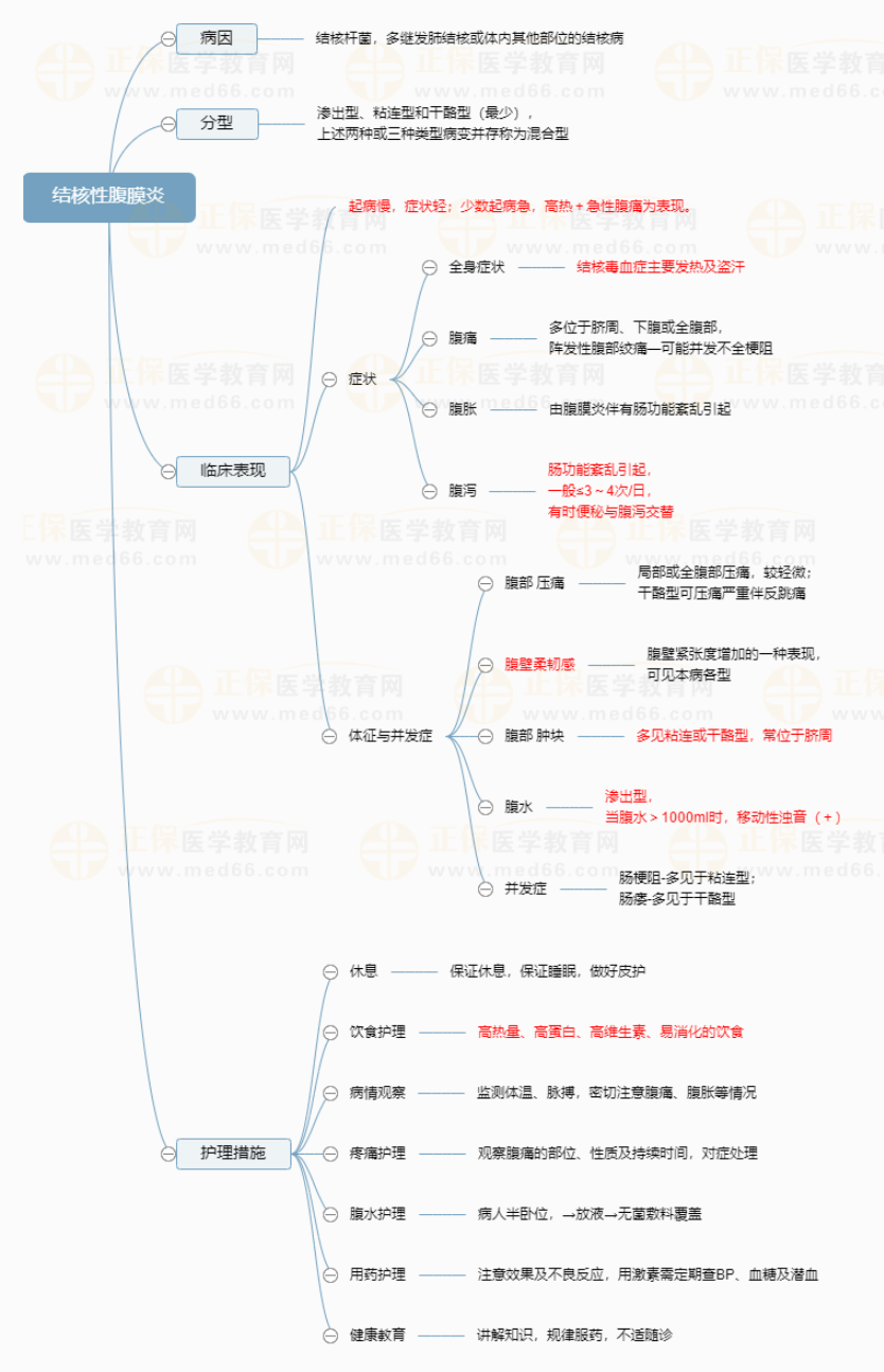 結(jié)核性腹膜炎病人的護理是歷年主管護師考試的常見考點,醫(yī)學教育網(wǎng)小編為了幫助各位考生更好的記憶掌握結(jié)核性腹膜炎病人護理的知識要點,專門將其整理成了思維導圖,希望能夠幫助到各位考生,同學們快收藏起來吧!