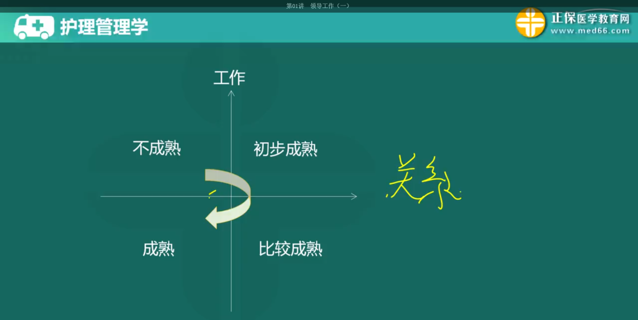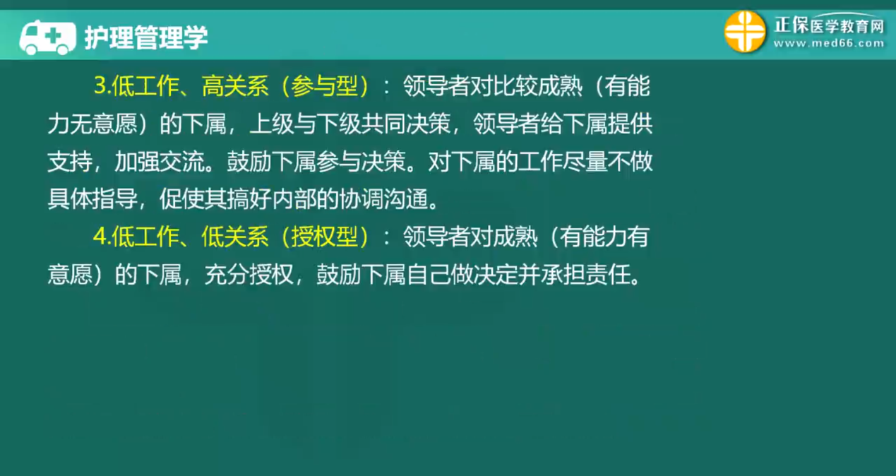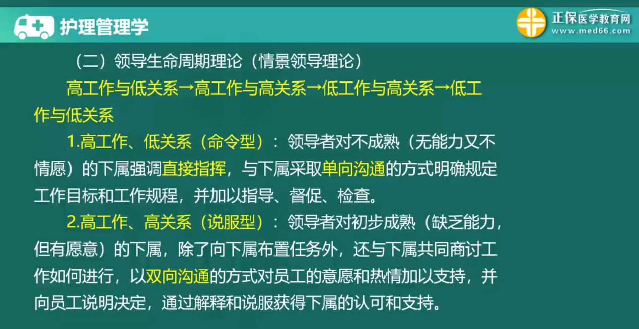 3、領(lǐng)導(dǎo)生命周期理論:高工作與低關(guān)系→高工作與高關(guān)系→低工作與高關(guān)系→低工作與低關(guān)系。