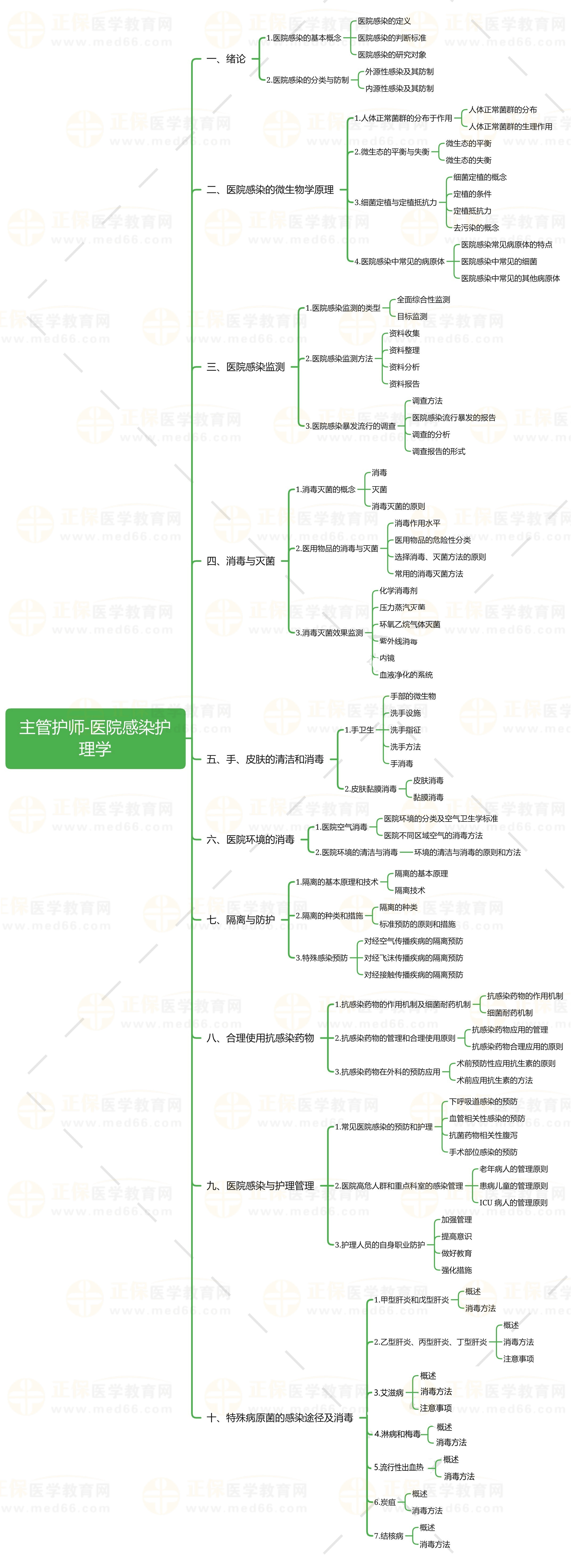 主管護(hù)師考試實(shí)行全國(guó)統(tǒng)一組織、統(tǒng)一考試時(shí)間、統(tǒng)一考試大綱、統(tǒng)一考試命題、統(tǒng)一合格標(biāo)準(zhǔn)的考試制度,原則上每年進(jìn)行一次。2024年主管護(hù)師考試新考期已經(jīng)開(kāi)始了,為了幫助各位考生理清考試知識(shí)點(diǎn)脈絡(luò),更有針對(duì)性復(fù)習(xí),醫(yī)學(xué)教育網(wǎng)為大家整理主管護(hù)師《醫(yī)院感染護(hù)理學(xué)》知識(shí)點(diǎn)地圖如下: