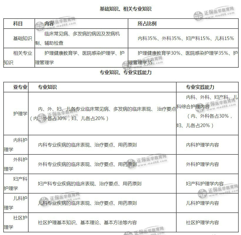 不同專業(yè)的基礎(chǔ)知識(shí)和相關(guān)專業(yè)知識(shí)考核內(nèi)容相同;專業(yè)知識(shí)和專業(yè)實(shí)踐能力考核內(nèi)容不同。舉例,內(nèi)科護(hù)理學(xué)369基礎(chǔ)知識(shí)和相關(guān)專業(yè)知識(shí)考核內(nèi)容跟護(hù)理學(xué)368相同,但是專業(yè)知識(shí)和專業(yè)實(shí)踐能力科目只考內(nèi)科護(hù)理學(xué)內(nèi)容。