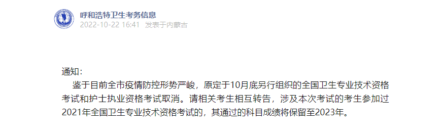 2022年呼和浩特10月底另行組織的主管護(hù)師考試取消