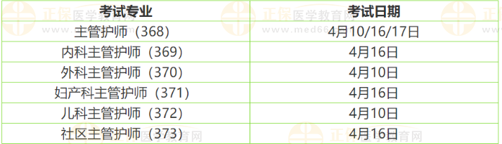 備注:護理學(xué)(中級,專業(yè)代碼368)專業(yè)考試時間為4月10、16、17日,考生參加其中一天的考試,具體時間以準(zhǔn)考證為準(zhǔn)。