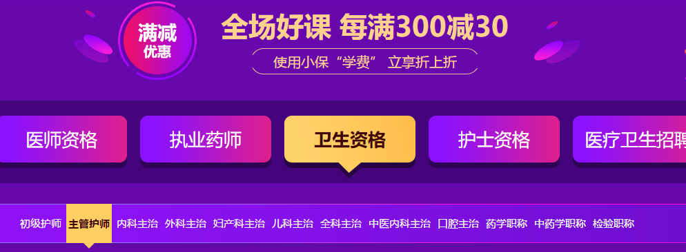 醫(yī)學(xué)教育網(wǎng)年中鉅惠活動(dòng)火熱進(jìn)行中。為助力各位考生更好的準(zhǔn)備2020年的主管護(hù)師資格考試,活動(dòng)除了滿300減30的優(yōu)惠,還有正小保的學(xué)費(fèi)可以領(lǐng),快來看看吧>>>