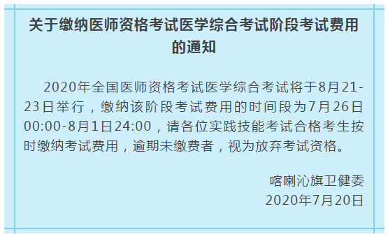 2020年全國醫(yī)師資格考試醫(yī)學(xué)綜合考試將于8月21-23日舉行,繳納該階段考試費用的時間段為7月26日00:00-8月1日24:00,請各位實踐技能考試合格考生按時繳納考試費用,逾期未繳費者,視為放棄考試資格。