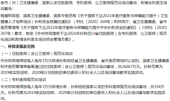 中央財政繼續(xù)按每人每年2萬元標(biāo)準(zhǔn)補助給經(jīng)省衛(wèi)生健康委、省中醫(yī)藥局組織認定的住院醫(yī)師規(guī)范化培訓(xùn)全科(助理)基地,共520萬元。補助對象為2020級計劃招收的單位委派人和社會人以及培訓(xùn)基地教學(xué)實踐活動。